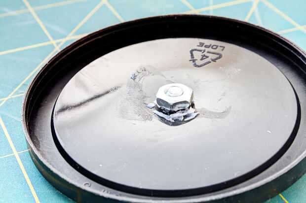 Montar el perno, spinner, tapa y tuerca y aplicar una capa gruesa de pegamento en el extremo del perno para evitar que la tuerca hace girar durante la reproducción.