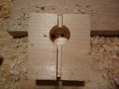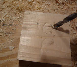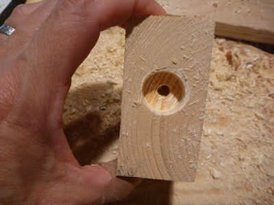 - Perfore agujeros de ojo (yo usé 1/4" bits) que se cruzan en el gran hoyo que ha perforado. Si haces los agujeros un poco bizco, funciona mejor.