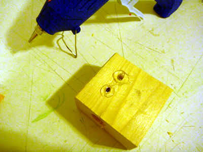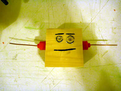OK, ahora vamos a trabajar en la cabeza. Sólo usé un bloque de pino de 2 x 4 de mi cubo de chatarra. Quería hacer más que tener una cabeza de bloque en mi ' bot, así que añadí un poquito de bling. Usé dos LEDs (uno rojo y uno color-ciclismo) y una batería de botón 3V. Básicamente es sólo un LED throwie, con ningún juego de pies soldadura o lujo necesario. Vamos a hacer la electrónica en el siguiente paso. Vamos a hacer la cabeza primero.