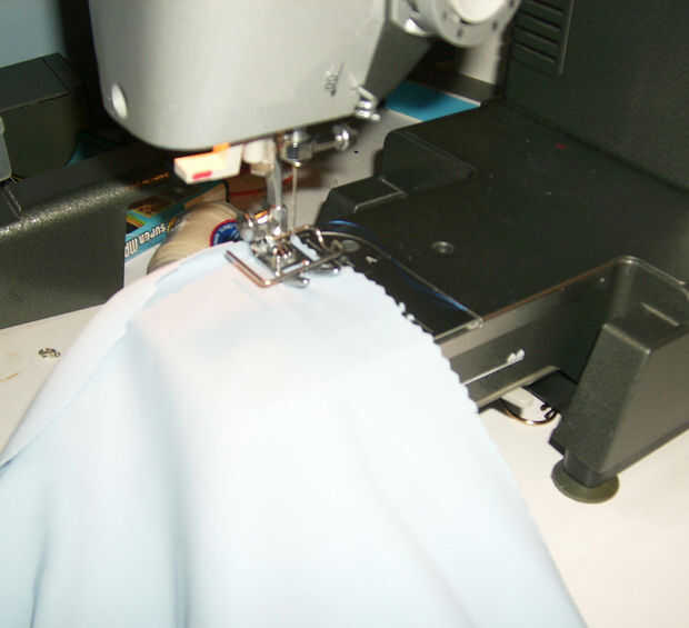 En su primera pasada de sttching, simplemente usa una puntada de zig-zag "2", alrededor de media anchura. Puede hacer una puntada más cerca, pero me parece que lo del manojo de la tela si no tienes cuidado.