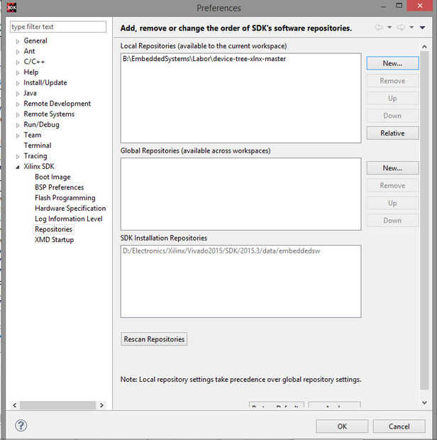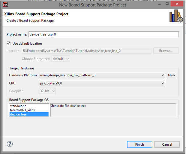 La carpeta descomprimida debe copiarse en el directorio del SDK. En los repositorios de dispositivos y herramientas de Xilinx añadir la ubicación de la carpeta del árbol de dispositivos. Siguiente paso es crear el dispositivo archivos de árbol. En archivo/nuevo crear nem Board Support Package y seleccione la opción del árbol de dispositivos. Anote el nombre de núcleo. No importa que base utilizar, pero utilizar esta base para todos los proyectos (el brazo en ZYNQ es un doble núcleo MPU). De