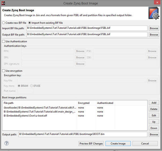carpeta. En SDK van a Xilinx herramientas/crear imagen de arranque de Zynq. El FSBL.elf debe agregarse como archivo del gestor de arranque, la design_wrapper.bit como datos. uBoot archivo debe ser renombrado a uBoot.elf y agrega a los archivos. El orden de los archivos es importante!