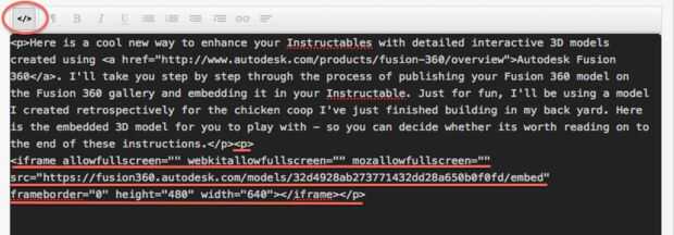 Ahora estás listo para incrustar el visor de modelo 3D en el Instructable. Desplácese hasta el paso a la que desea agregar el modelo y haga clic en el botón "<> /" a la izquierda de la barra de herramientas formato para cambiar a vista HTML. Pegar el código iframe que copiaste en el paso pasado en el HTML donde quieras que se muestre. En el ejemplo de la captura de pantalla he envuelto el elemento iframe con un elemento de párrafo ("< p >< /p >").