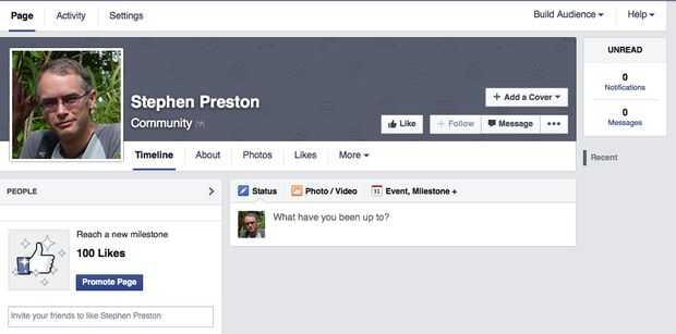 Haga clic en el botón 'Empezar'. Esto lleva a una serie de formas de configuración. Lo que pones aquí deberían resultar evidente, así ahorraré espacio por no mostrar las imágenes. Una vez hayas creado la página, tienes que hacer clic a través de unas ventanas emergentes de información. Cuando hayas hecho esto, tu página debe ver algo como la imagen final (pero obviamente con su propio nombre de la página y la foto-no la mía).
