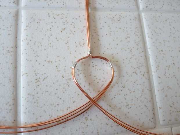 Grupo los cables 18 calibre en dos grupos de tres. Unen los centros de cada sistema como te muestro en los pasos 3 y 4 de mi tutorial de colgante envuelta de alambre (wire wrap básico).