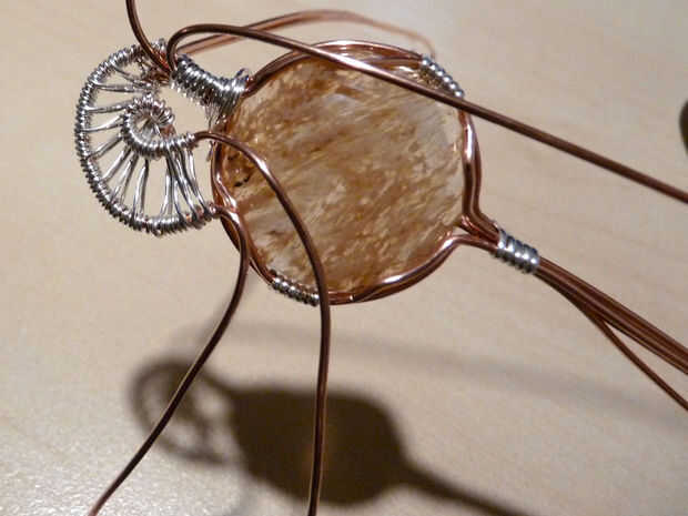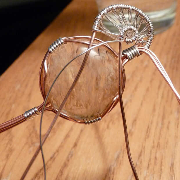Una vez que el cuelgue de ella, empecé a cambiar el patrón. Generalmente trabajo en forma muy libre, como un pintor. Decidí torcer el alambre interior en sí mismo en la parte superior y cambie el color del cable. También, he trabajado fuera de la bobina de alambre. Lo que significa, no corté mi alambre tejido hasta que me cansara de una sección. Hago mucho trabajo de detalle y filigrana con mi envoltura de alambre y dejar mis opciones abiertas.