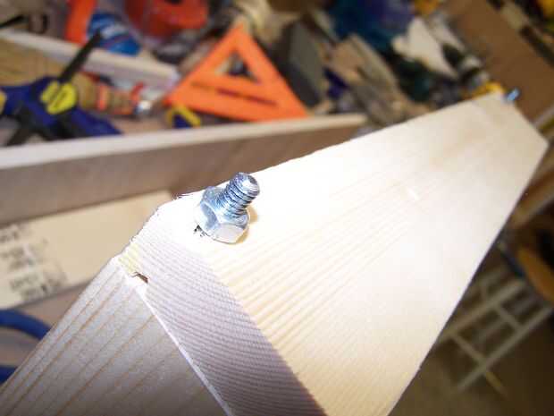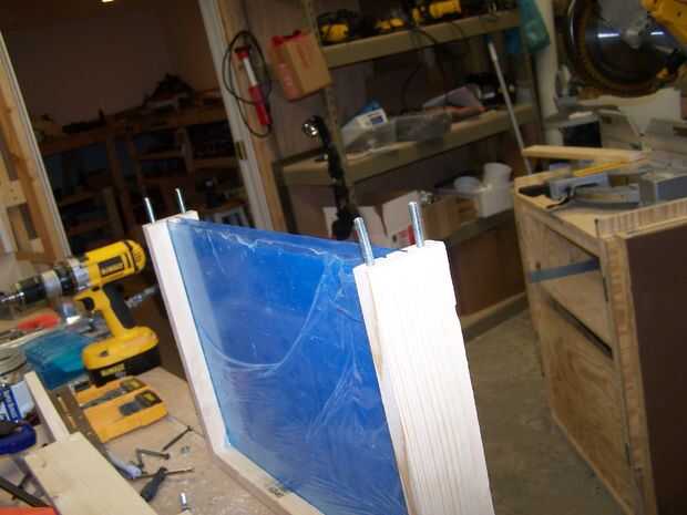 Empezar por el tablero superior en lugar de sujeción y taladrar agujeros guía a través de la junta superior de los tableros laterales, teniendo cuidado con las ranuras de las ventanas. A continuación inserte varillas roscadas en los agujeros piloto en las piezas laterales. Agrandar los orificios en la pieza superior para que la pieza superior puede resbalar fácilmente sobre las varillas roscadas. A continuación coloque una arandela sobre cada varilla roscada y una tuerca. Tuercas de mariposa son agradables para esto porque puede más fácilmente apretarse a mano pero tuercas regulares serán demasiado.