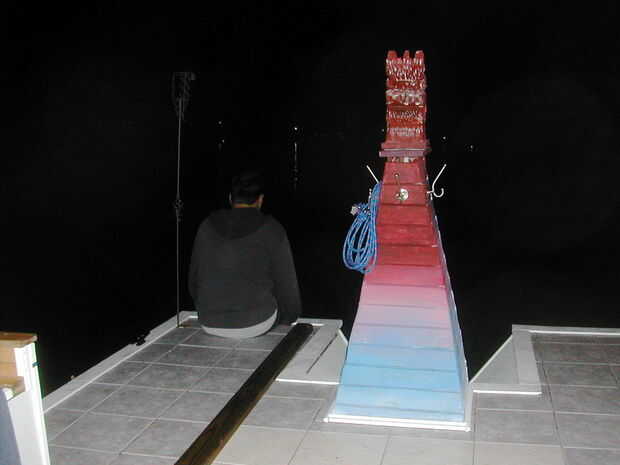 Lanzó en la noche como para no dibujar demasiada atención en el embarcadero. Paseos de noche son agradable y sereno. Sin ruido además de la suave ondulación del agua que es empujado a un lado por el barco que se desliza a lo largo. Y es ideal para la pesca también.