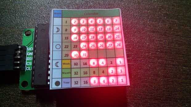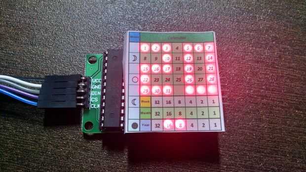 El número de semana, el mes y el año se muestra en notación binaria en la matriz de LED.