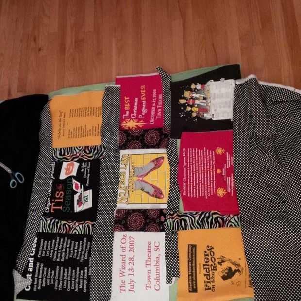 Arreglar el corte camisetas y las piezas de la tela contrastante para el diseño de su manta. Me pareció más fácil poner todo en el piso (aunque mi perro mantenido tratando de poner en él mientras que estaba diseñando).
