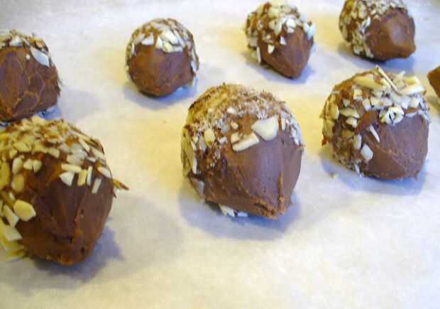 5. rodar la bola de masa en las almendras finamente picadas, teniendo cuidado de no para cubrir su nariz y la cara de almendras. La masa es pegajosa, puede que necesite limpiar las manos después de rodar cada pequeño erizo.