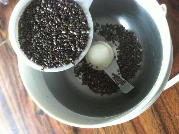 Empezar por pulido 1TBS de semillas de chia en polvo usando un molinillo de café o especias.