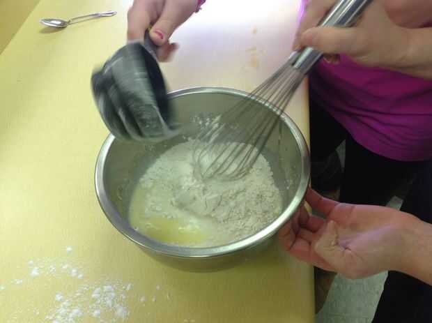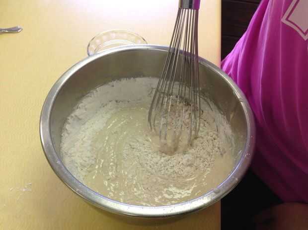 Agregar resto de harina, mezcla hasta que no se mezcla ya. Cuando no se pueden mezclar ya Coloque la masa sobre una superficie enharinada y amase la harina restante en él. Continuar amasando hasta que la masa quede lisa.