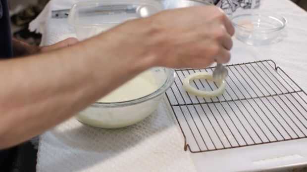 Nos sumerja la cebolla en la masa, luego colocarlos sobre una rejilla que dejen el goteo de exceso.