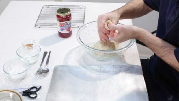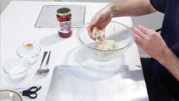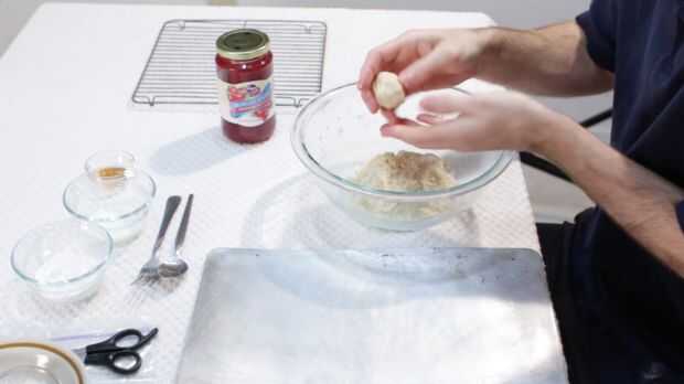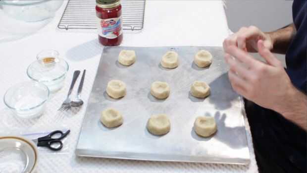 Ahora formamos las galletas. Un poco de masa y rodar juntos en tus manos, creando una bola, que es aproximadamente 1.5 pulgadas de diámetro. Entonces use su pulgar para empujar hacia abajo el centro para crear una chuleta para las conservas en. Coloque en una charola engrasada sin.