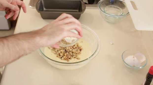 Ahora vamos a añadir nuestros plátanos a la mezcla, junto con las nueces. Luego mezclar todo junto.