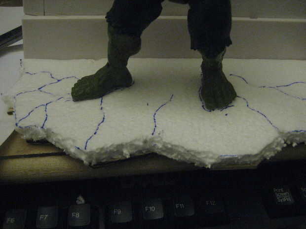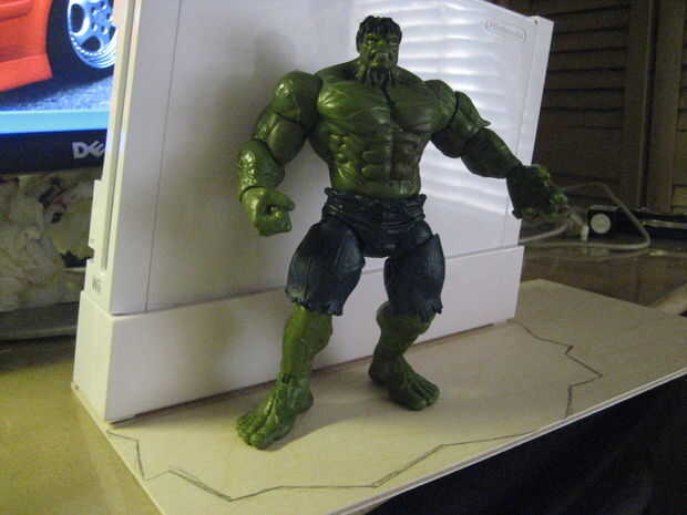 En esta Wii que decidí hacer la Wii base de más de un stand. Yo otra vez planeado para un rato, pensando en qué hacer con la figura de Hulk. Mi plan era hacer la Wii en más de un diorama, que representa una escena en la que Hulk está haciendo cuál es natural para él lleno de destrucción! El fondo es madera delgada cortada en forma, en la que luego cortar algunos espuma de poliestireno y utiliza un cuchillo para cortar arboledas en él para que se vea como una calle rota. Hice la pared de bloques de la misma manera lo hizo a base de Mario Wii, a través de alguna arcilla en él sculpted los bloques entonces tomó un molde e hizo una copia exacta con Bondo. Entonces ajustaron los lados en la base. Como se puede ver que corte de un lado para que se vea como la pared es rota. Al pegar las piezas de bloque en que decidí ocultar puerto usb extra en la parte delantera. Luego añadí la electrónica a la base.