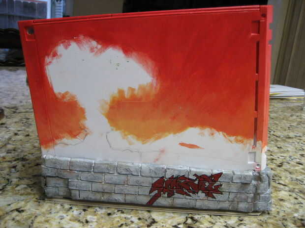 Aquí voy a explicar brevemente cómo modifiqué el caso de la Wii, ya que estaba pintando en su mayoría no debe tomar mucho. Primero trazó el Wii en algún papel entonces poner un pedazo de plexiglass sobre el papel y diseñó los edificios de barro. Lo mismo se hizo para el Logo y la explosión de la bomba Gamma salvo hizo la copia de epoxy con colorante verde, en lugar de Bondo. Los edificios fueron entonces pegados en y se pintó la Wii, después de pegado en el Logo y la nube de la seta.