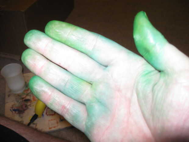 Si este tinte llega a sus manos en todo, será allí por al menos una semana! Mi guante tiene un agujero en un dedo mientras que saca hacia fuera el tinte verde. Obtener de usted rápido y se queda allí. Curiosamente, el tinte parece no afectar al tejido de la cicatriz...