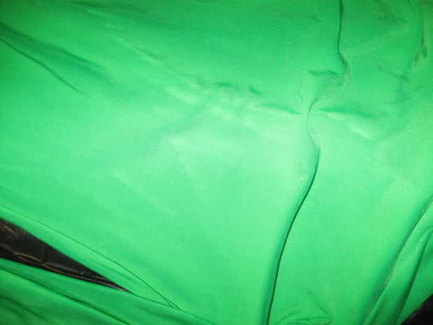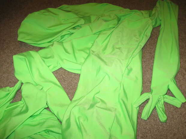 Cuando llegó, con impaciencia abrí mi paquete para averiguar que no era el color correcto! Era como un color verde pálido y de Lima en lugar del verde que yo quería. Después de investigar un poco, descubrí que el material del spandex del lycra en realidad tenía un montón de algodón en ella. Por lo que luché algunas ropa tinte para hacer mi traje la derecha color verde.