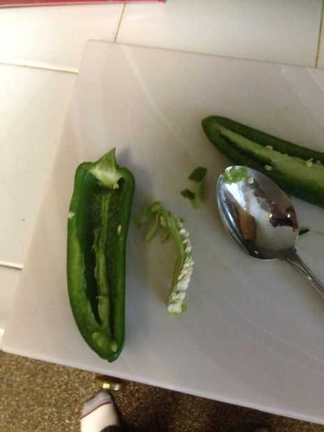 Qué vas a hacer es agarrar una cuchara y sacar las entrañas. Esto es donde usted puede controlar la cantidad de su calor. Para poppers más picante, dejar más la membrana. Para un refrigerio más manso, sacar todo de los blancos. Guardar una gran pila de semillas para un futuro paso...