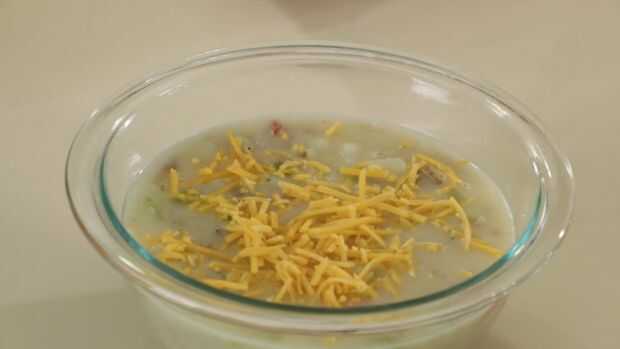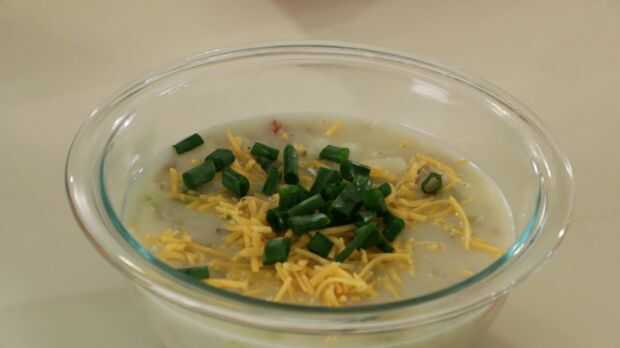 esto es una adaptación de la sopa mi madre cuando yo era un niño.  Y la uno sopa que todo el mundo le gustaba.  Mi marido dice que no es sopa, es una "experiencia".  Papa, queso, tocino, crema agria y cebolla verde en un tazón; cálida y buena.