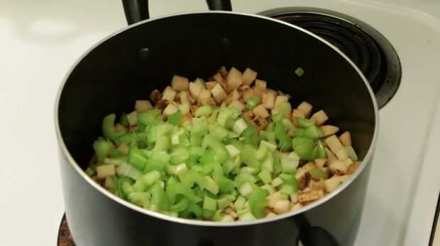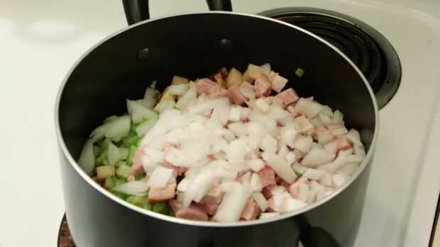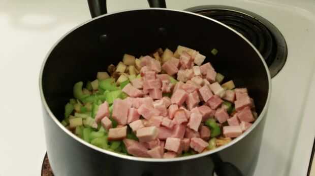 Paso 1: Se combinan patatas, apio, jamón y cebolla