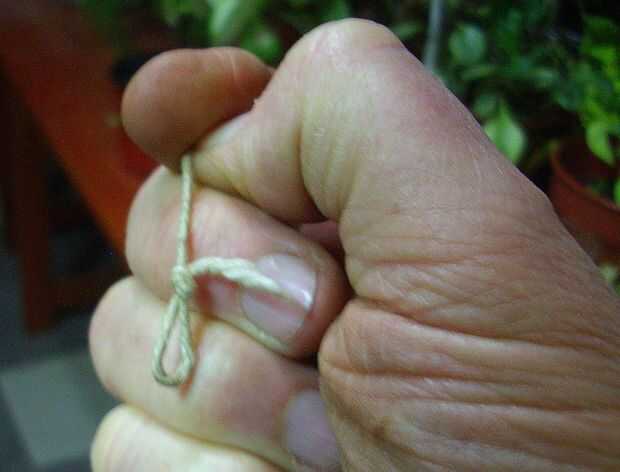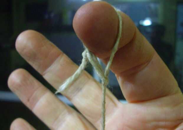 Buscábamos un trozo de hilo de atar paquetes, de aproximadamente un metro de largo. Eso era fácil, porque mi mamá tenía un cajón en el comedor, donde guardaba papeles, hilos, corchos, y toda cosa podría haber tirado a la basura pero que, antes una fuerte lluvia nos podría aislar por varios días, ella conservaba para cualquier necesidad. Al hilo le hacíamos un ojal pequeño en cada extremo, a modo de argolla para lazo. Luego pasábamos el cuerpo del hilo por dentro del ojal, el de párrafo metiendo dedo dentro del lazo, este quedara apretado.