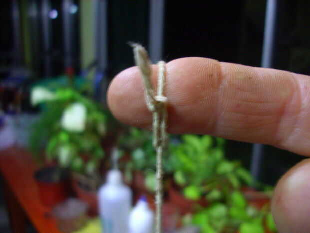 Queríamos un trozo de hilo para atar paquetes, de alrededor de un metro largo. Eso fue fácil, porque mi madre tenía un cajón en el comedor donde guardan papeles, hilo, corcho y todo lo que podía haber lanzado lejos pero, sabiendo que podríamos aislar por una intensa lluvia por varios días, ella salvó a cualquier necesidad. Donde anudar un pequeño ojal en cada extremo, como un anillo de lazo. Luego pasamos por el cuerpo de alambre dentro del ojo, para poner su dedo dentro del lazo, este será apretado. Una vez que el hilo, convenientemente acondicionado, fue en una cuchara o tenedor, alpaca pesado aquellos que se usaban antes, pero hoy podemos hacer ver muy bien con una de acero inoxidable. Pero debe ser todo el metal, no deben tener mango, plástico o madera. Aunque el mango es metálico, esto debe ser una sola pieza con el resto, no unida con remaches. Nos ató la cadena a la mitad de la cuchara o tenedor, para que cuelgue más o menos equilibrada.