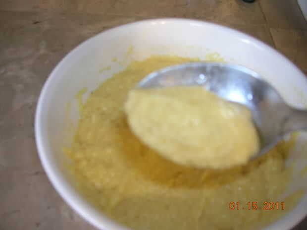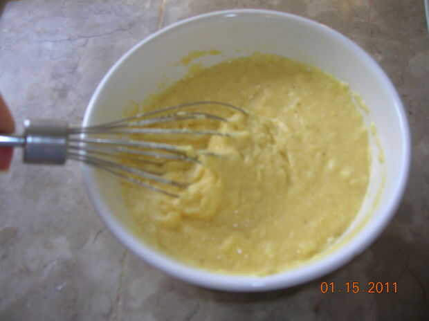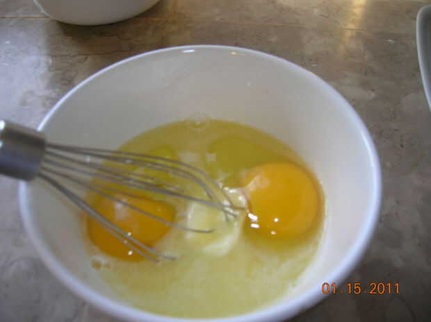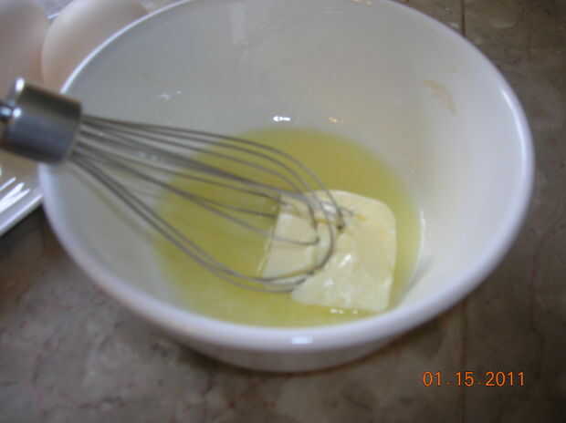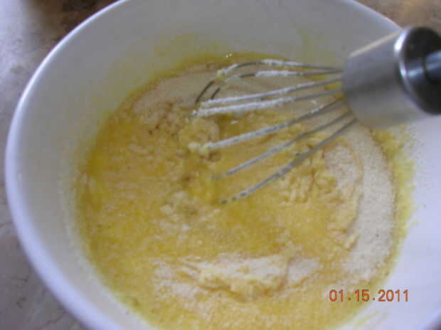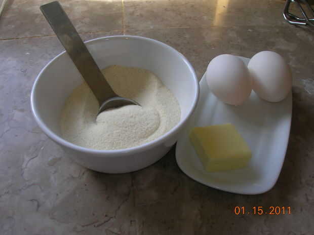 Primero se derrite la mantequilla en el microondas y añadimos los huevos. Empezar a mezclar juntos. Agregue lentamente la harina de sémola, 1 cucharadita a la vez, hasta obtener una composición gruesa.