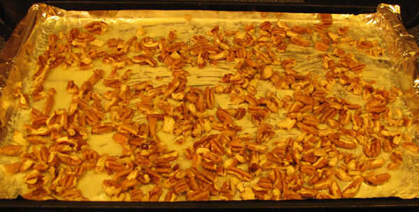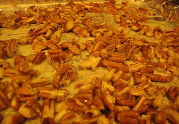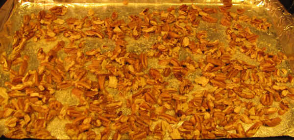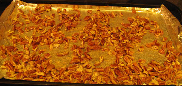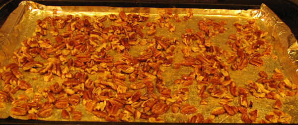 Como he dicho, esta es una receta muy sencilla, pero es que todavía un poco las manos en. Derrite 1 barra de mantequilla y vierta en una placa para horno forrada de papel de aluminio. Luego esparcir 2 tazas de pecanas a la hoja para hornear y el toss, asegurándose de cubrir bien las tuercas. Por último, Espolvoree sal sobre la nuez de mantequilla cubierto y hornee a 300 grados por 15 minutos. Mezclar las nueces y cocer al horno por otros 10 minutos. Mezcle la nuez nuevamente y cueza al horno por otros 5 minutos (este paso se repite hasta que se realicen las tuercas). Debe comenzar a probar las tuercas después de 35 minutos. Se busca de un agradable sabor tostado y una sensación de boca fresco, no masticable y no quemada.