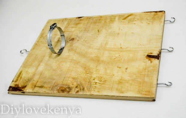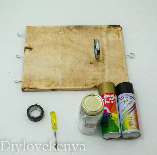 Consigue un trozo de madera, algunos ganchos de metal y una abrazadera de metal, por lo que se puede colgar del clavo de tres ganchos en la parte inferior de las teclas y uno en la parte superior. Usted también necesitará algunas, un tarro de masón, un destornillador y cinta de color.