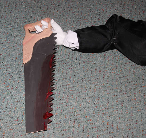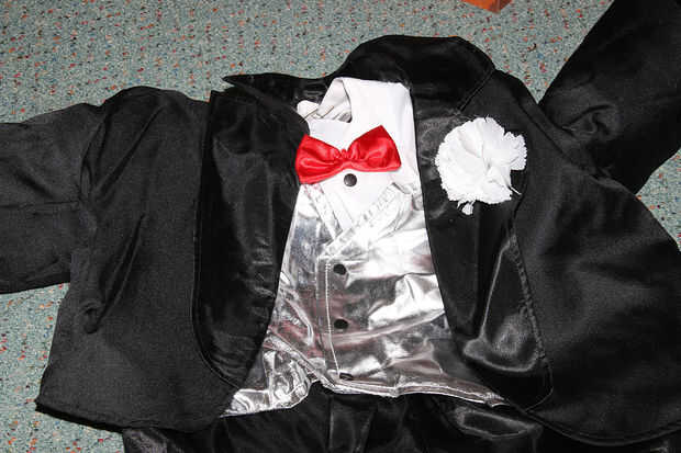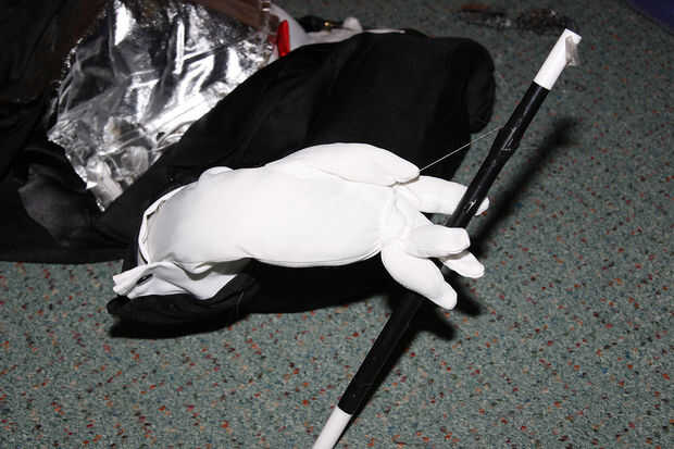 Para hacer el traje de mago para Phoenix, hemos comprado un traje de mago para un niño humano. Vino con un chaleco plateado y chaqueta negra con un collar. Cortamos el agujero del cuello un poco más grande para que sea fácil caber en cabeza de Phoenix, y nos ataron la parte inferior de la vestimenta para que él no viaje en él. Rellena las mangas del traje de va en los hombros con relleno, para parecerse a los brazos de un ser humano. Para hacer las manos, nos rellena los guantes, empujando el relleno en cada dedo para que se vea tan realista como sea posible. Es importante no lo sobrecargue y asegúrese de que los dedos son más anchos en la parte inferior que en la parte superior parece real los dedos. Luego atamos los extremos de los guantes en las mangas de la ropa de mago, asegurándose de que las mangas negras estaban en el exterior de los guantes para una mirada realista. Utilizamos el sedal para atar el mango de la sierra en un guante, asegurándose de que en los dedos por separado y posicionarlos correctamente. Nos habían atado a finales de la varita mágica sobre el otro guante de la misma manera. Hemos pegado el clavel en la solapa de la chaqueta, para añadir un toque extra. Para el sombrero y peluca, utilizamos elástico para agregar una cadena para que siga en cabeza de Phoenix. También nos pega cinta roja para una banda de la gorra, para que coincida con su atuendo.
