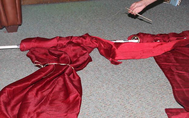Para hacer la etapa para el telón de fondo, atamos paneles de la cortina de la ventana a un pasador largo. Corte tiras de alambre de aproximadamente 5" de largo y trenzado a través del material a la espiga en varios lugares, a lo largo de la longitud de la espiga, para sostenerlas en lugar. Luego atamos la cenefa de la misma manera en el centro de la espiga, superposición de los paneles de la ventana. Luego rosca hilo dental a través de dos tiras de cinta adhesiva y les envuelve cada extremo de la espiga, por lo que podría ser colgado para arriba en cualquier lugar. Utilizamos un mantel de tela roja detrás de la cortina, para completar el look.