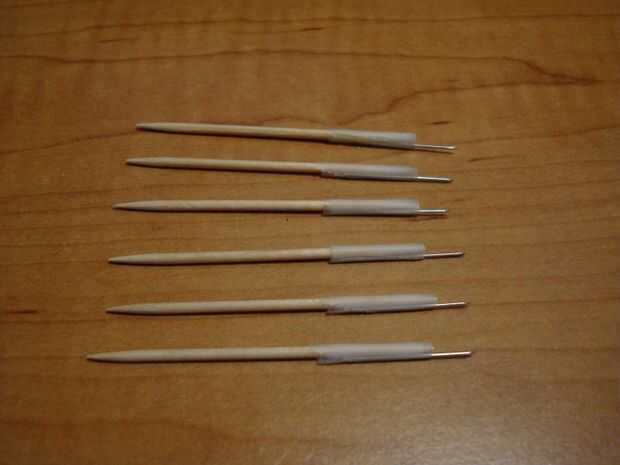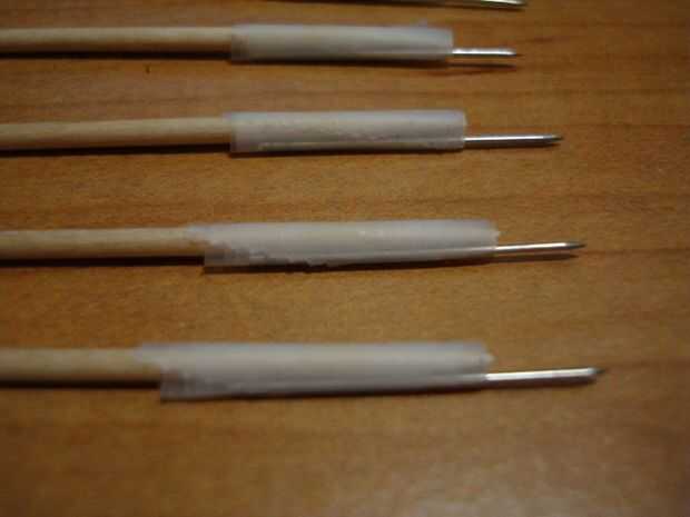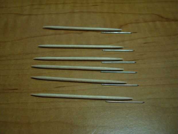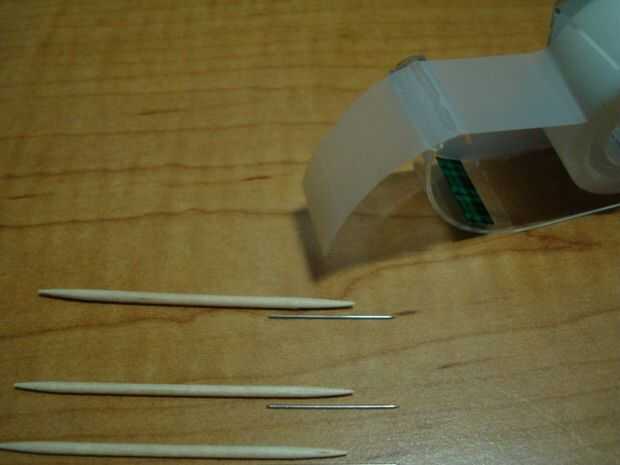 Para cada dardo, use aproximadamente una pulgada de cinta scotch para sujetar el alfiler o aguja en el palillo de dientes. Si usa alfileres rectos con una cabeza de metal, no te preocupes el bulto que es causado por la cinta sobre la cabeza del perno - puede parecer gracioso, pero no afectará negativamente a la utilidad del dardo.
