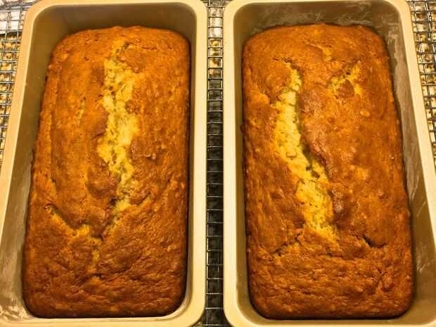 Pan de plátano fresco en bandejas 10 minutos antes de retirar rejillas de alambre.