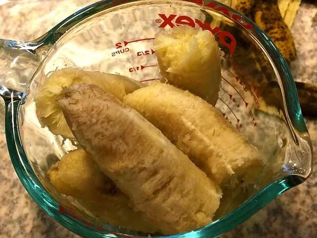 Romper los plátanos en un tazón pequeño. Usando la parte inferior de una cuchara o un tenedor para pisar las bananas hasta que los plátanos están bien molidos.