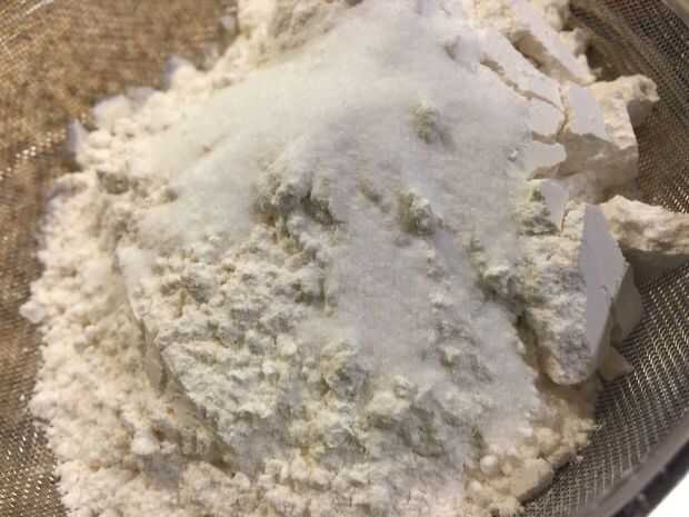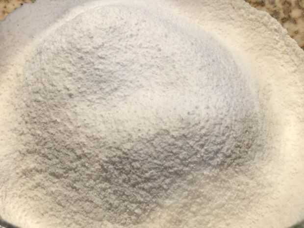 Tamice juntos la harina, bicarbonato, polvo de hornear y la sal. Reservar 1 cucharada de mezcla de harina, dejando a un lado (para tuercas con recubrimiento).