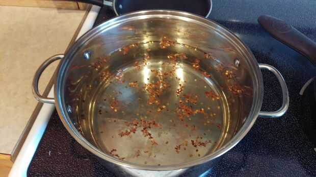 -Luego añada suficiente agua a la olla que cocinará su 1 libra de fideos de pasta. Generalmente yo llenar 1/2 a 3/4 completo. También agregar tus copos de pimiento rojo al agua. Esto ayudará a los fideos de la temporada para que tengan sabor y no confían completamente en la salsa. Coloque la jarra sobre los quemadores de alta.