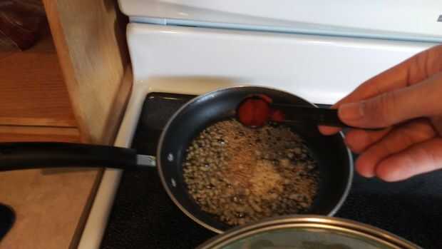 -Comience por agregar las 4 cucharadas de aceite de oliva y 3 cucharaditas de aceite de sésamo en una cacerola pequeña y vuelta a fuego medio.