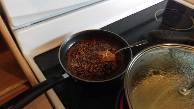 -Por último agregar el 1-2 cucharaditas de mantequilla de cacahuete (yo uso una cuchara de metal y a apoyarla en el plato y la mantequilla de maní se cae de la cuchara una vez que se calienta). Dar un revuelo para fundir en esa mantequilla de maní.
