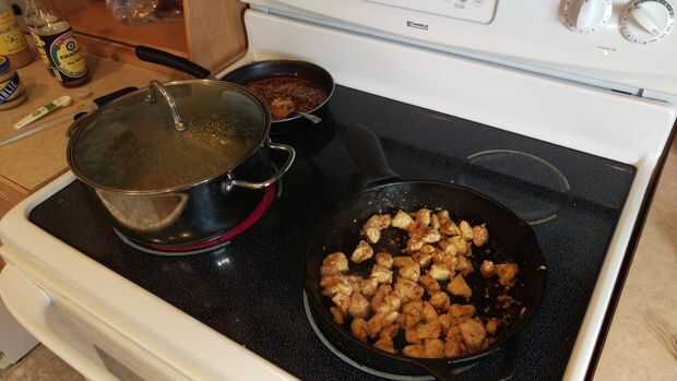 Como el agua de los tallarines enfoques hirviendo y sus trozos de pollo son acabado que hasta puede empezar a la salsa.