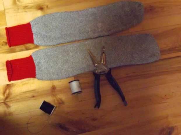 Depende de lo grande de un sombrero que desee. Utilizar un calcetín, "cuerpo", si se quiere, para la parte gris/blanco del sombrero. El sombrero blanco tomó cerca de 2 y medio calcetines para el rojo y negro, "borde". El borde rojo sólido tiene las piezas rojas de dos corte por la mitad y se volvió hacia los lados.