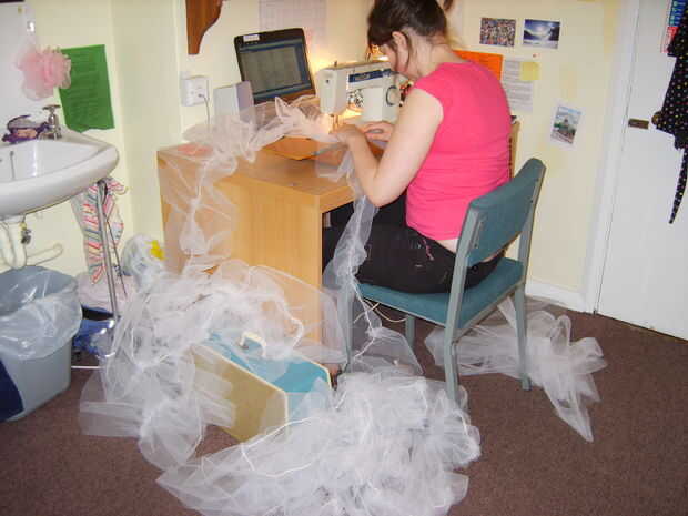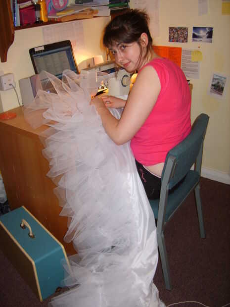 Paso 6: esto es donde yo totalmente te luchó tienes que reunir 16m hasta unos 1,5 metros (o lo que la circunferencia está en el punto en tu falda de círculo que es 9inches de la cintura) reunido con sedal y luego coser sobre él por la máquina, pero cuando me doblé cliped fishingline ampliado a dos veces la longitud de lo que quería (por lo que podría utilizar un método diferente) así que lo que hice fue por la mitad y coser en como dos capas.