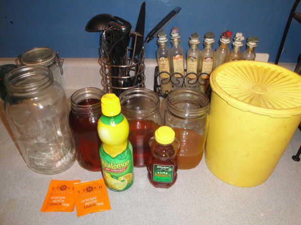 Algo para mantener cerveza té (tarro grande a la izquierda. El vidrio es preferido, ya que no estropea el sabor del té.)