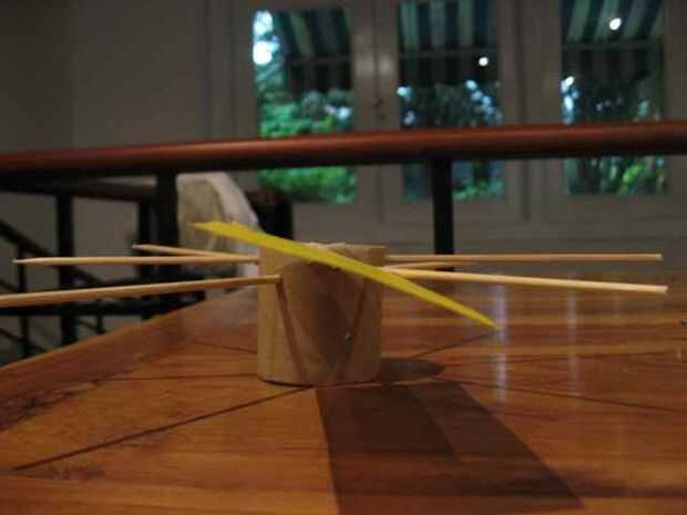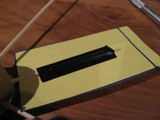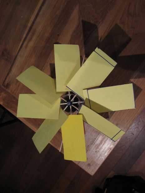 Una vez que tenga todas sus hojas, sujete a los pinchos en ángulo leve. Usé cinta aislante para colocar minas para reducir el peso pero estoy seguro que pegamento u otros tipos de cinta funcionaría igual de bien. Asegúrese de que todas las cuchillas son aproximadamente equidistantes desde el centro del tubo (esto asegura que es más estable que gira con gracia hacia abajo).