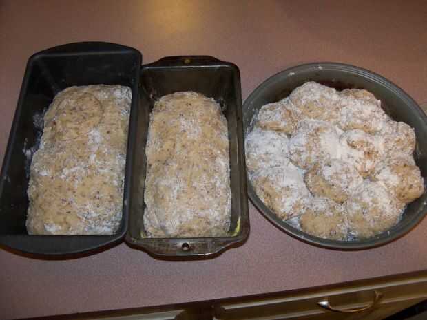 Llenar el molde de pan de 1/3 a 1/2, o hacer bolas de 1-2 pulgadas para los rodillos. Ligeramente la harina todo lo posible para que las cosas no se pegue.