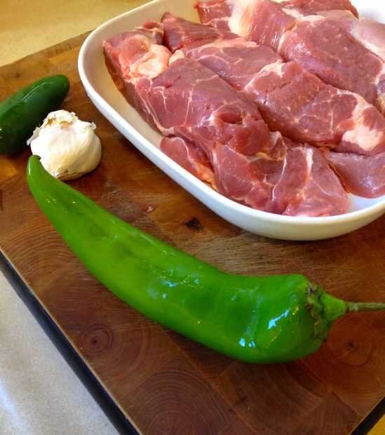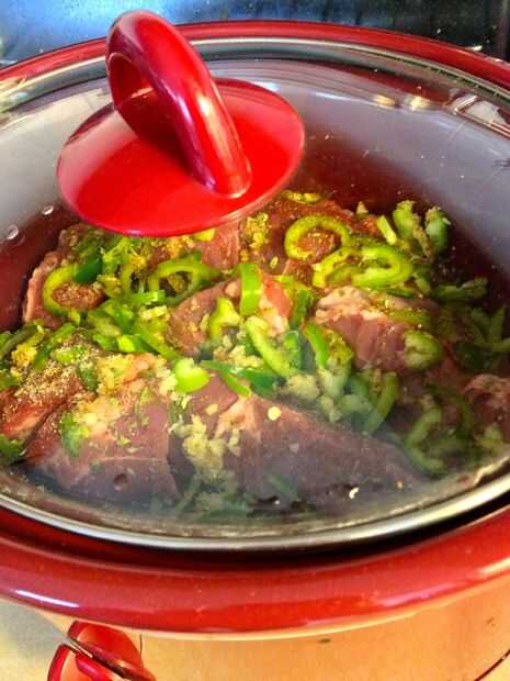 En primer lugar, salir de la olla y mezcle su cerdo en él. Cortar el pimiento, teniendo cuidado de quitar las semillas. Pele aproximadamente picar el ajo y echarlo en la olla, también. Si lo tienes, lanzar en 1/2 cucharada cada de comino, orégano y cebolla en polvo. Los ingredientes secos son opcionales, pero si los tienes recomendaría usarlos.