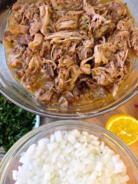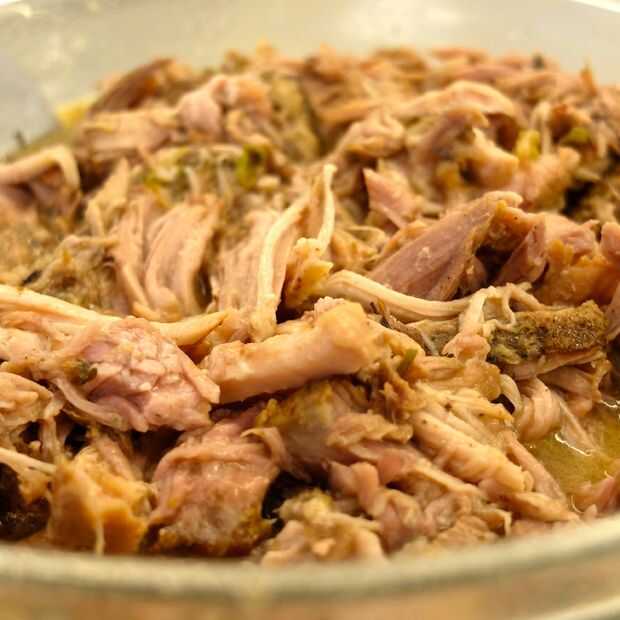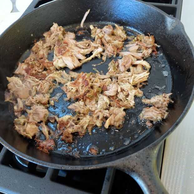 El cocinar es fácil. En la sartén caliente (gas en lo alto por unos minutos antes) Vierta 4-6 cucharadas de aceite en la sartén. Usando las pinzas, llene el fondo de su bandeja con una capa de carne de cerdo deshebrada parcialmente. No revuelva. Abra su calor al medio y deje cocinar por unos minutos. Luego, reorganizar la carne que puede nítidas las partes que no son nítidas. Después de unos minutos más, debe comenzar a calentar sus tortillas, preferiblemente en otra sartén o sobre una llama abierta.