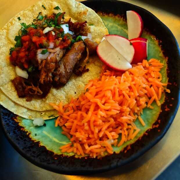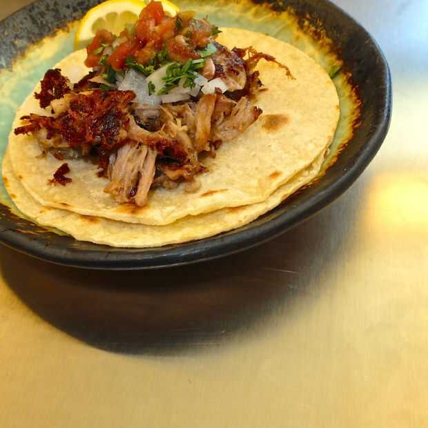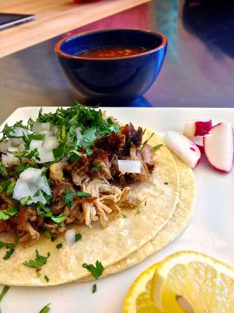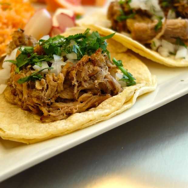 Para servir, calentar dos tortillas por taco y los ponen en un plato uno encima del otro. Coloque unas carnitas en las tortillas, espolvorear con cilantro y cebollas blancas y bofetada una cuchara de salsa de primera clase en cada taco. Decorar con rabanitos en cuartos y rodajas de Lima o limón.